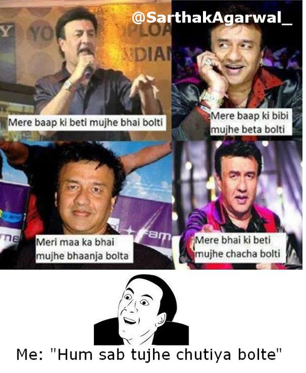Mai kya bolne aaya hun. Memes can be edgy, but try to remain mostly civil (no racism, bullying, etc.) do not encourage or participate in brigading of any subreddits or of any users of reddit. The best anu malik memes and images of april 2021. Dank indian memes indian memes indian memes compilation. However, twitterverse erupted with memes and gifs trolling the judges for their selection of contestants during auditions. A meme of anu malik. Don't be a total dick. ~ in a recent interview, anu malik talks about his desire to never write an autobiography as he believes his life to be an ongoing. Wishing singer & music director anu malik a very happy birthday. Facebook gives people the power to share and makes the world. Anu malik is removed from indian idol, priyanka and nick jonas got married? Anu malik reveals the story behind his catchphrase aag laga dega. Find and save anu malik memes | from instagram, facebook, tumblr, twitter & more.